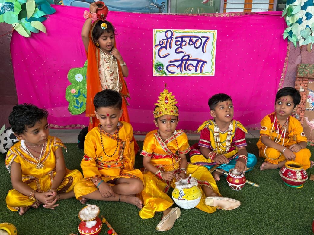 Our Nursery to U.K.G. students joyfully celebrated Janmashtami by dressing up as Lord Krishna, Radha, and friends from Krishna’s childhood. Filled with songs, stories, and devotion, the day was a vibrant blend of culture and fun.