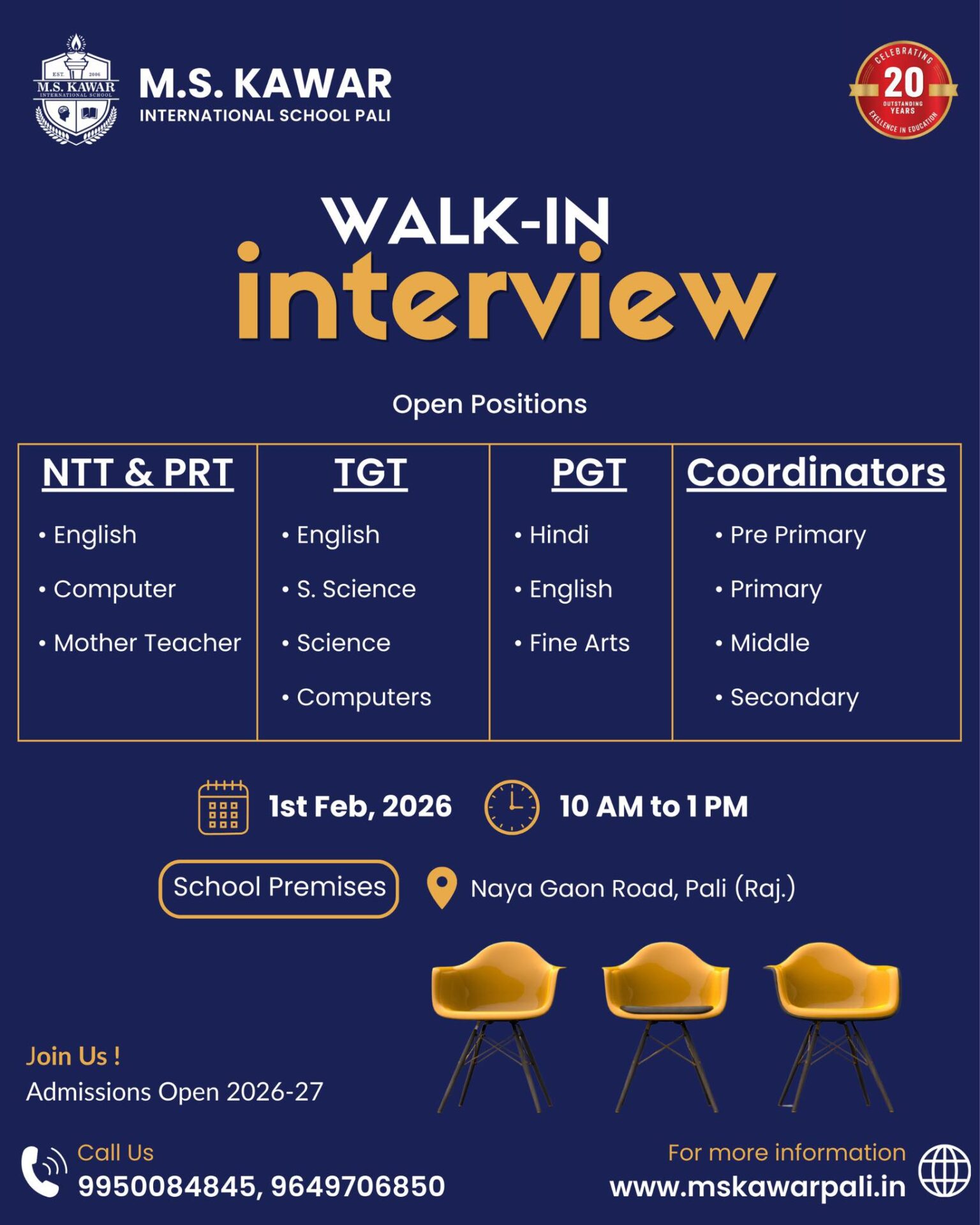 Join our walk-in interview for NTT/PRT, TGT, PGT & Coordinator roles at M.S. Kawar International School, Pali — on 1st Feb 2026 from 10 AM–1 PM.
